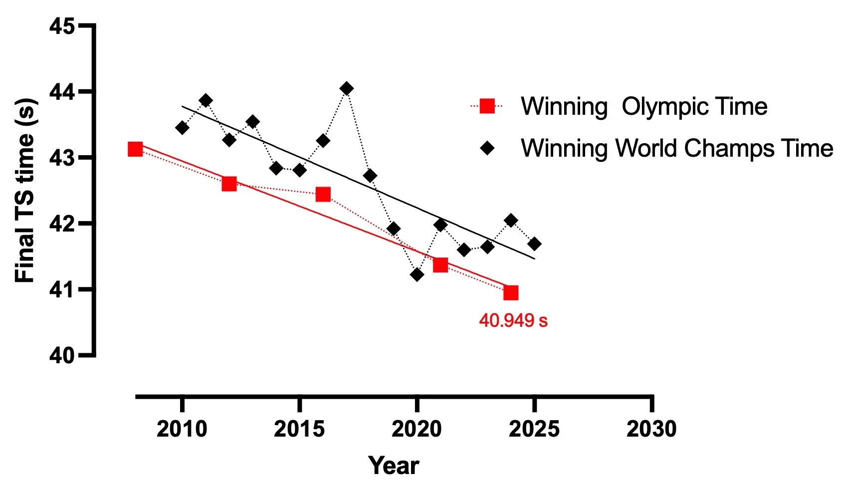 Twelve months later, the 2025 World Championship was won in 41.69.